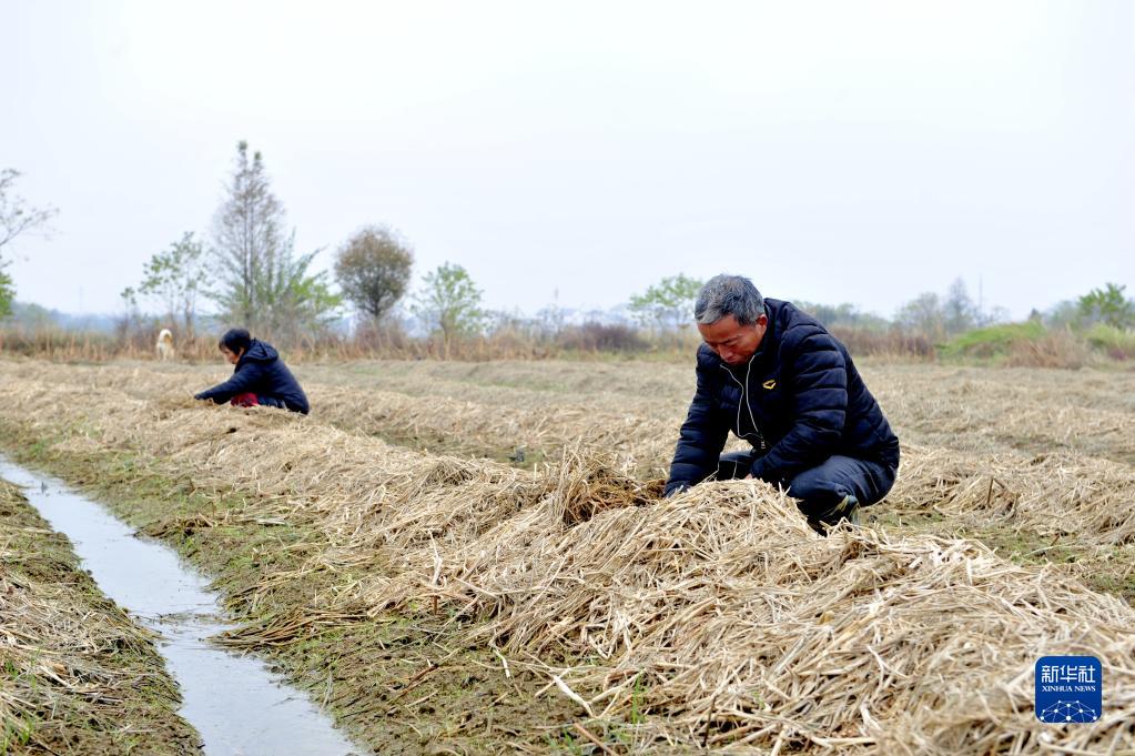 在江西省南昌市南昌縣幽蘭鎮,村民們在收割后的晚稻田里利用處理過的秸稈種植大球蓋菇(12月7日攝)。