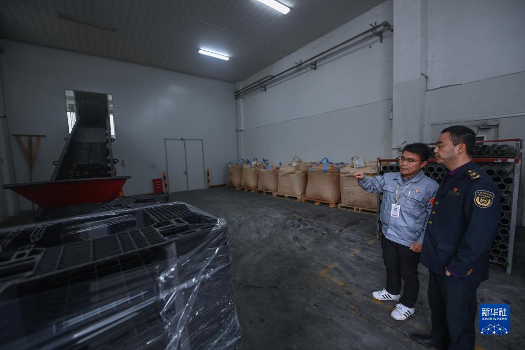 12月9日,在位于杭州市臨安區的杭州福斯特應用材料股份有限公司,杭州市生態環境局臨安分局的工作人員(右一)了解企業廢塑料循環再造的情況。該企業通過自主研發,將企業內部產生的一般塑料固廢和廢塑料桶制作成塑料托盤,降低了固體廢料的排放。新華社記者 徐昱 攝