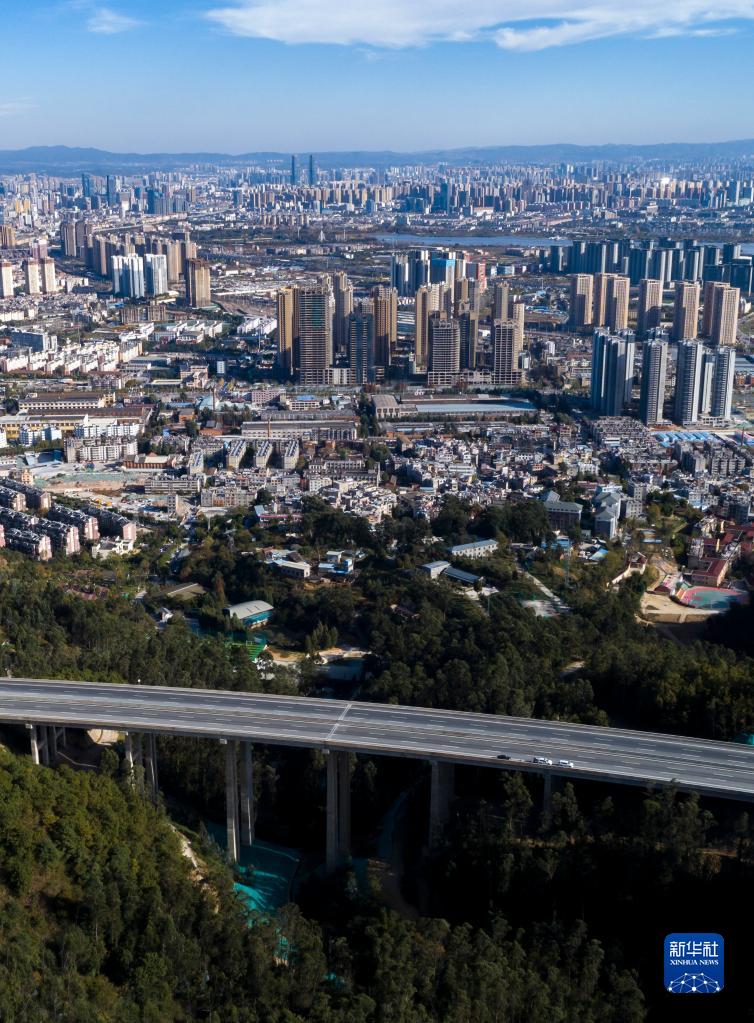 這是12月8日拍攝的新昆楚高速昆明入城段一景,遠(yuǎn)處是昆明主城區(qū)(無人機(jī)照片)。新華社記者 陳欣波 攝