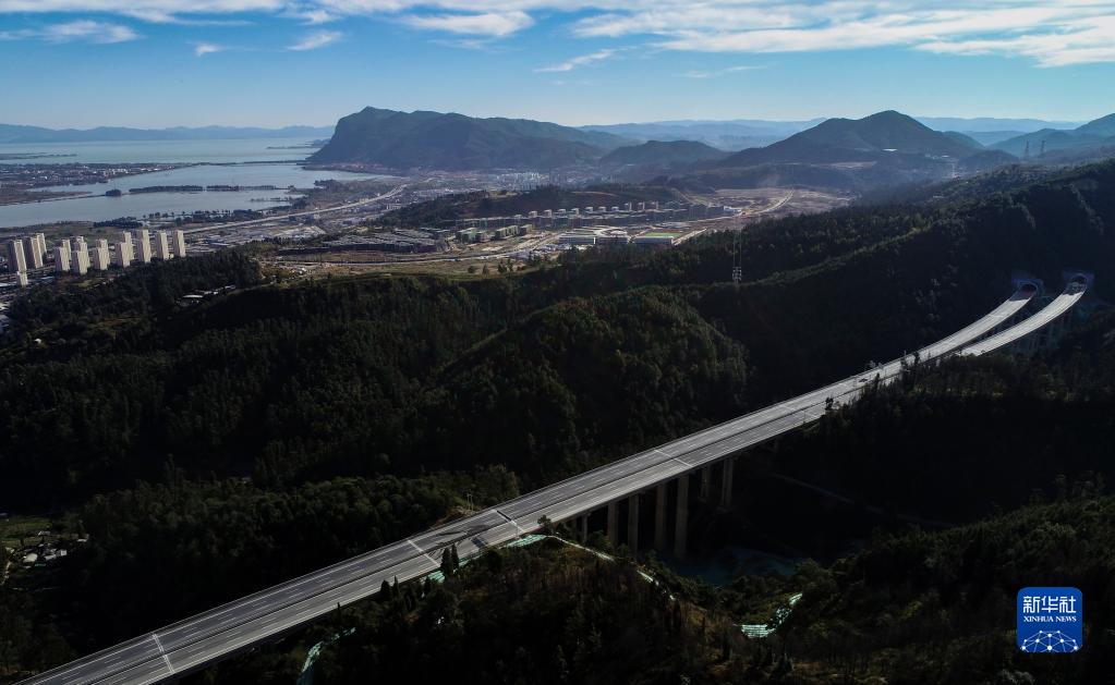 這是12月8日拍攝的新昆楚高速昆明入城段一景,遠處是昆明滇池及西山景區(無人機照片)。新華社記者 陳欣波 攝