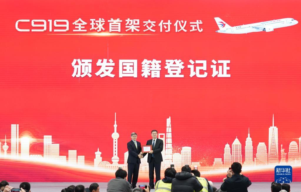 12月9日,在交付儀式現(xiàn)場(chǎng),民航華東地區(qū)管理局向東航頒發(fā)國(guó)籍登記證。