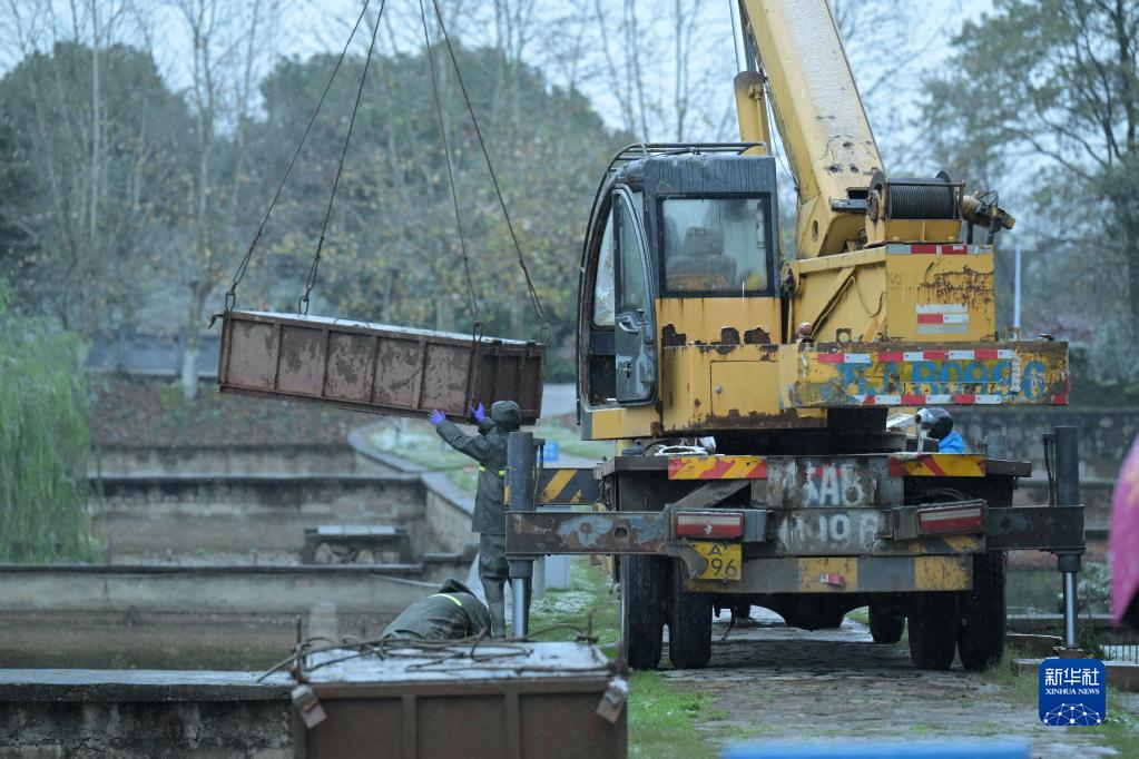 11月30日,在安徽揚(yáng)子鱷國(guó)家級(jí)自然保護(hù)區(qū)夏渡片區(qū),工作人員用吊車(chē)將人工繁育的揚(yáng)子鱷裝箱轉(zhuǎn)移到越冬暖房。
