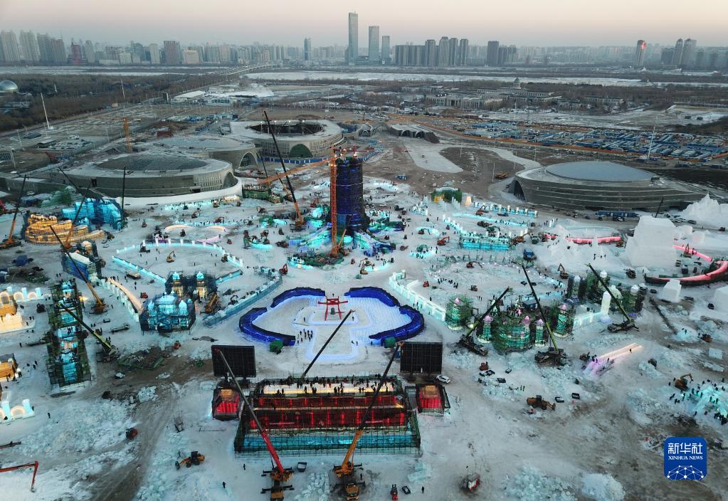 12月8日,工人在哈爾濱冰雪大世界園區施工(無人機照片)。