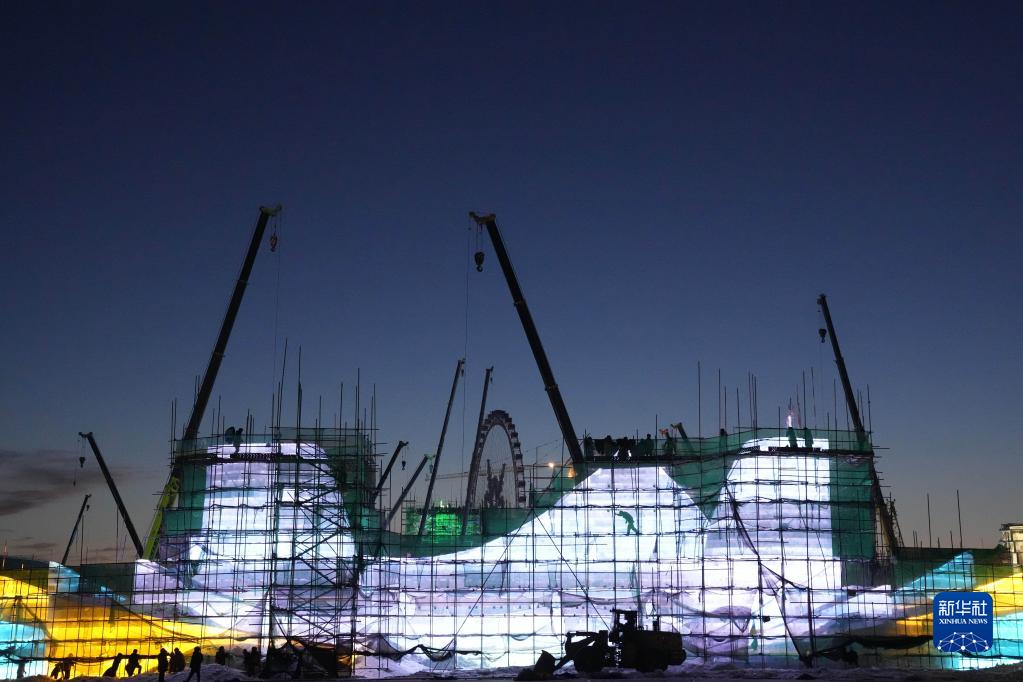12月7日,工人在哈爾濱一處冰雪景觀建設現場施工。