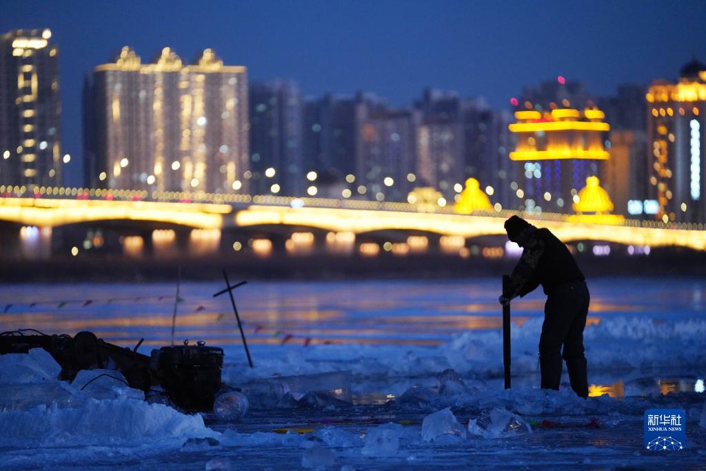 12月7日,工人在松花江哈爾濱段冰封的江面上進行采冰作業。