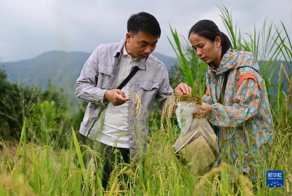 賀治洲(左)和團隊專家林秋云博士(右)在海南白沙調查、收集山蘭稻種質資源(10月28日攝)。新華社記者 蒲曉旭 攝