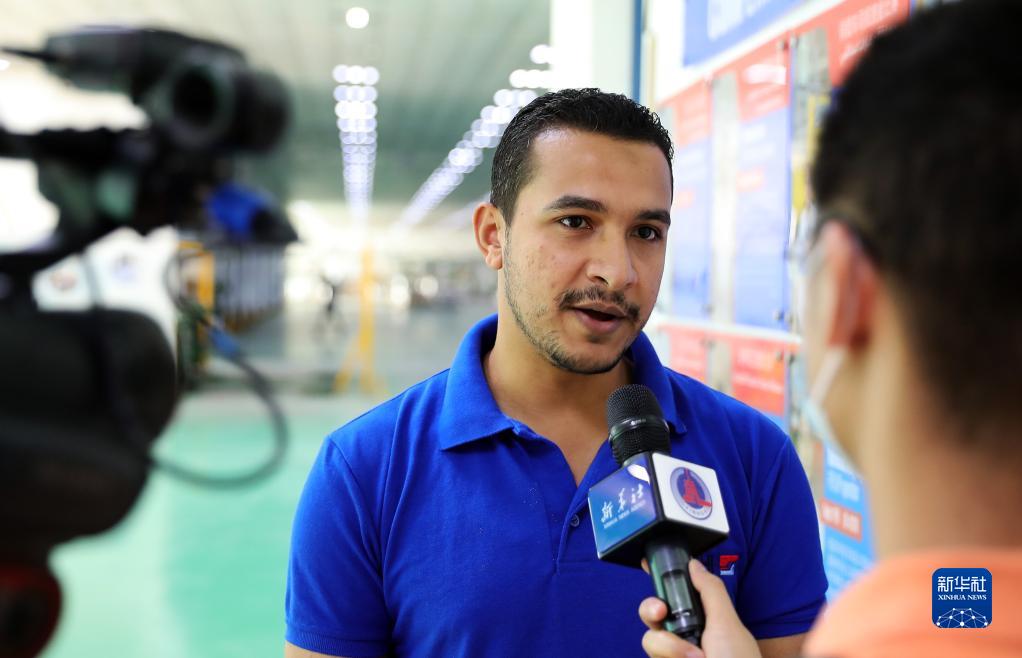 9月7日,在埃及蘇伊士省蘇赫奈泉港,中國巨石埃及玻璃纖維股份有限公司(巨石埃及)員工艾哈邁德·蘇萊曼接受新華社記者采訪。