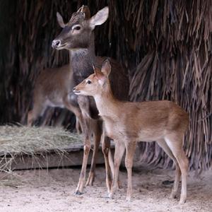 當日,廣州長隆野生動物世界成功繁育的兩頭國家一級保護動物海南坡鹿與游客見面。這兩頭海南坡鹿幼崽分別出生于2022年10月4日和22日,均為雄性。