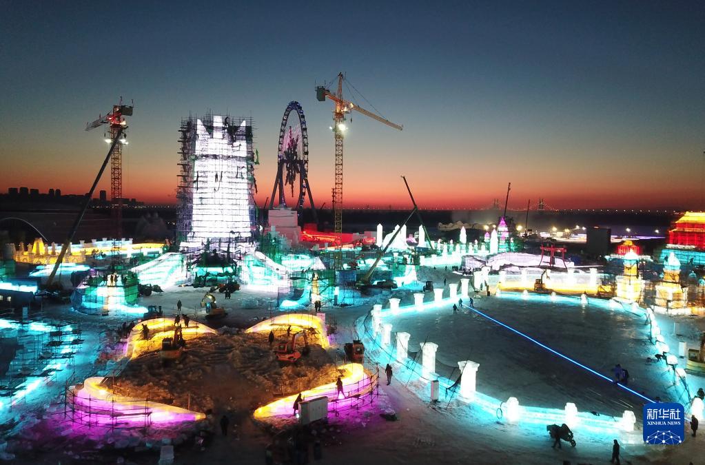 12月9日,哈爾濱冰雪大世界園區(qū)主塔“冰雪之冠”在進(jìn)行燈光調(diào)試(無(wú)人機(jī)照片)。