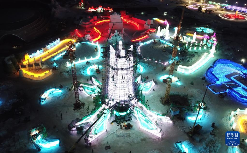 12月9日,哈爾濱冰雪大世界園區主塔“冰雪之冠”在進行燈光調試(無人機照片)。