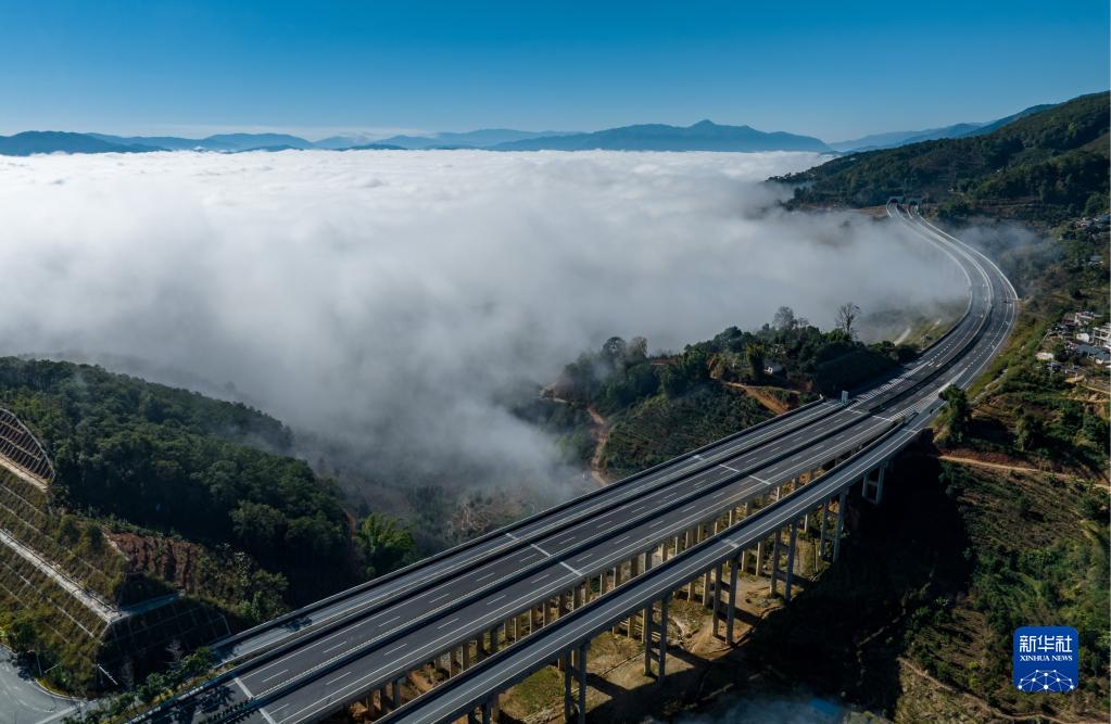 這是在云南省臨滄市拍攝的云海間的天猴高速(12月8日攝,無(wú)人機(jī)照片)。
