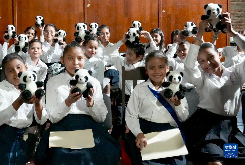 12月8日,在位于尼加拉瓜首都馬那瓜的國(guó)家劇院,參加慶祝中尼復(fù)交一周年專場(chǎng)音樂(lè)會(huì)的學(xué)生手捧熊貓玩偶。