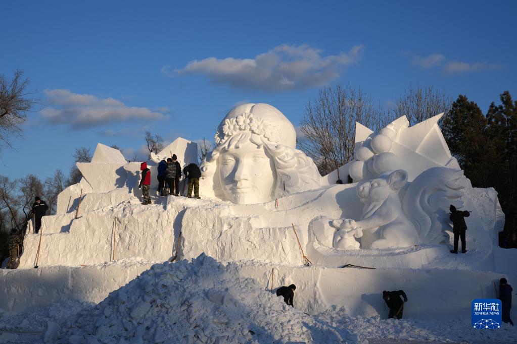 12月9日,雪雕師在哈爾濱太陽島雪博會園區(qū)進行雪雕創(chuàng)作。