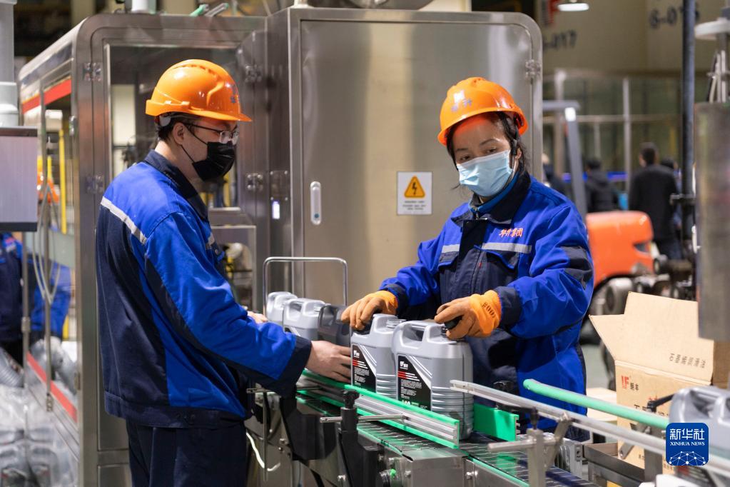 工人在位于鶴崗市的黑龍江省華升石墨集團股份有限公司車間內進行石墨烯潤滑油生產作業(12月8日攝)。