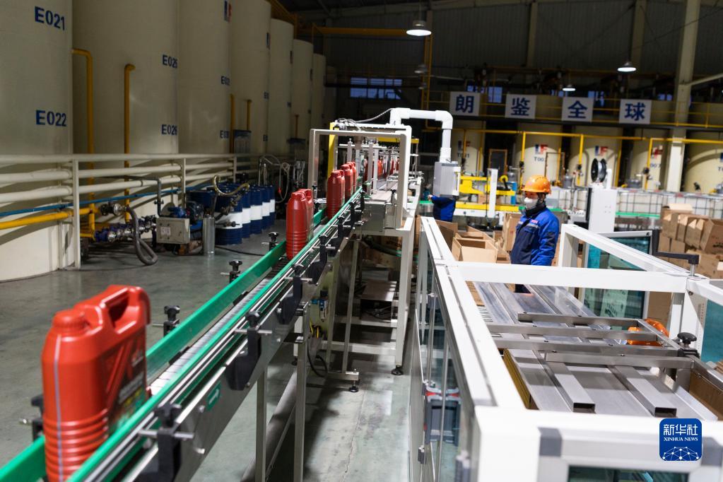 工人在位于鶴崗市的黑龍江省華升石墨集團股份有限公司車間內進行石墨烯潤滑油生產作業(12月8日攝)。