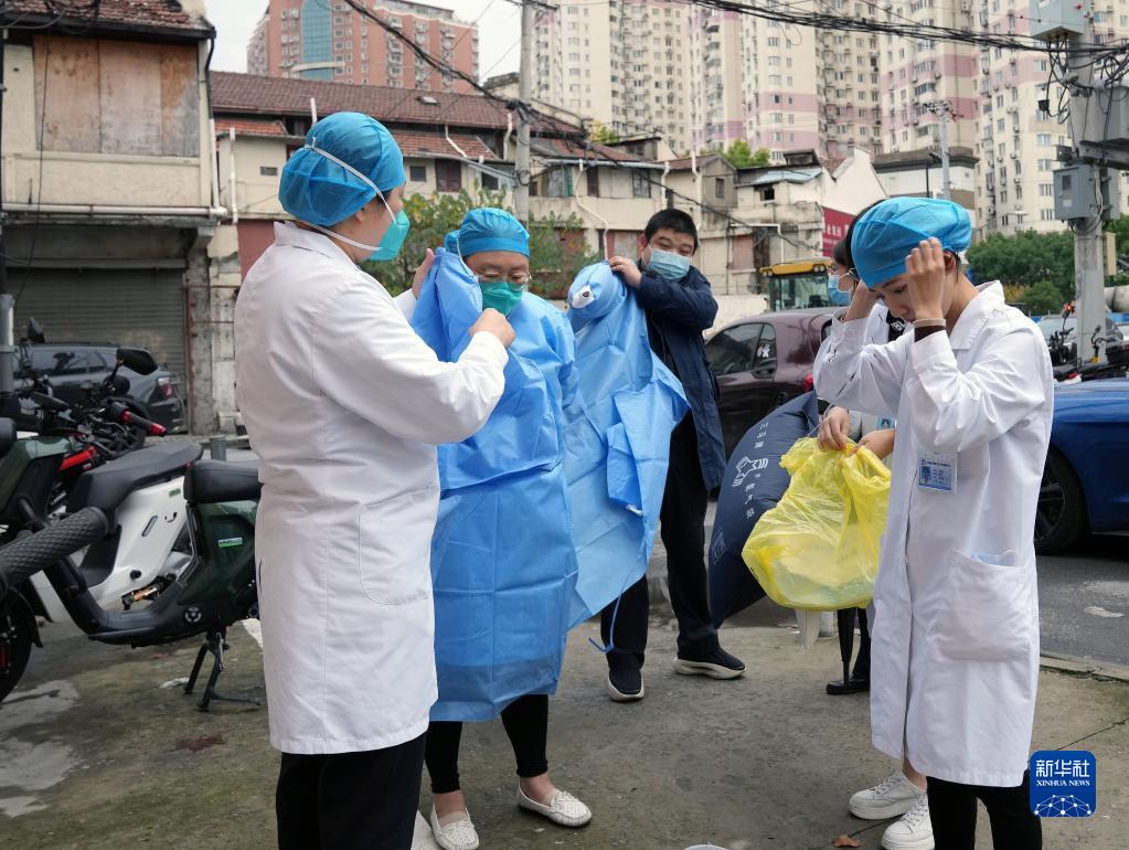在黃浦區(qū)順昌路上,接種小分隊(duì)的醫(yī)護(hù)人員在小區(qū)門(mén)口穿戴隔離衣物(12月5日攝)。