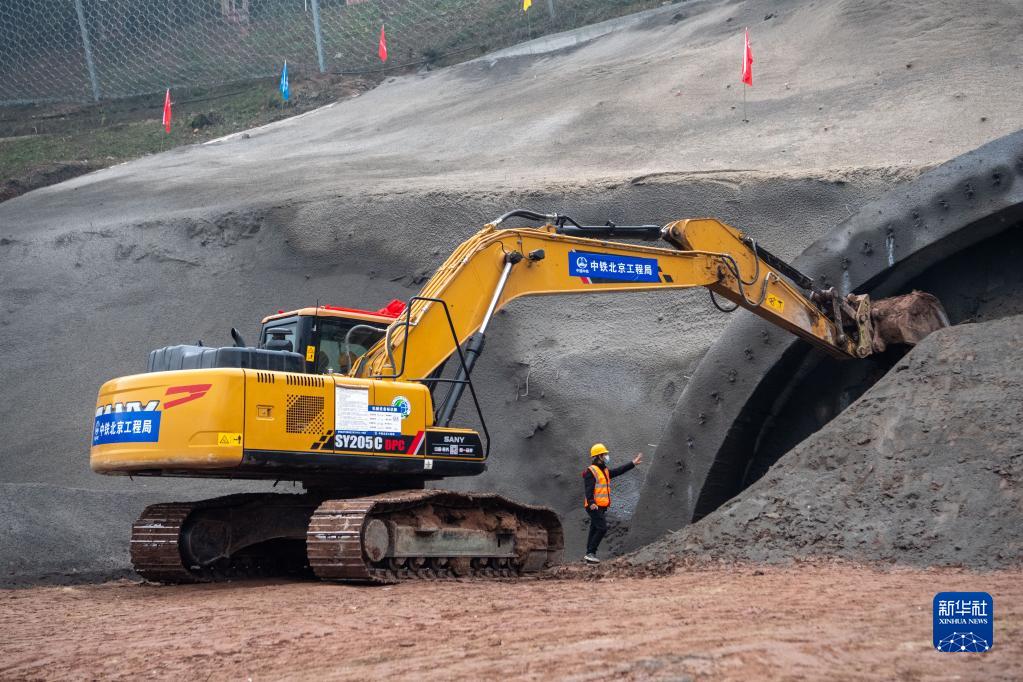 12月11日,工程機械在成達萬高鐵光明隧道施工現場作業。