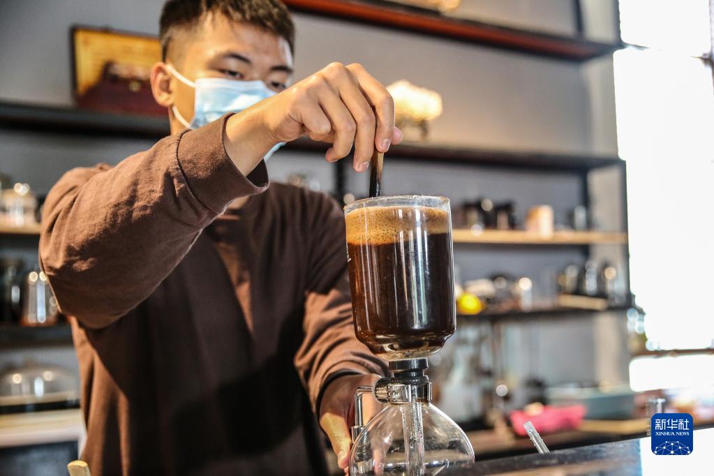 12月10日,在位于海南澄邁的才存咖啡館,返鄉(xiāng)大學(xué)生、咖啡師徐取凡在煮咖啡。