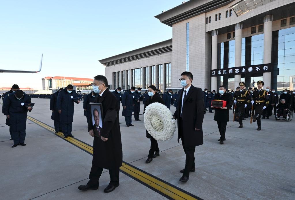 12月11日,遵照江澤民同志及其親屬的意愿,敬愛的江澤民同志的骨灰在長江入海口撒入大海。受黨中央委托,中共中央政治局常委、中央書記處書記蔡奇等領導同志和江澤民同志的夫人王冶坪等親屬護送骨灰撒放。這是在北京西郊機場,江澤民同志的親屬捧著遺像、骨灰盒和花圈,緩步走向專機。新華社記者 燕雁 攝