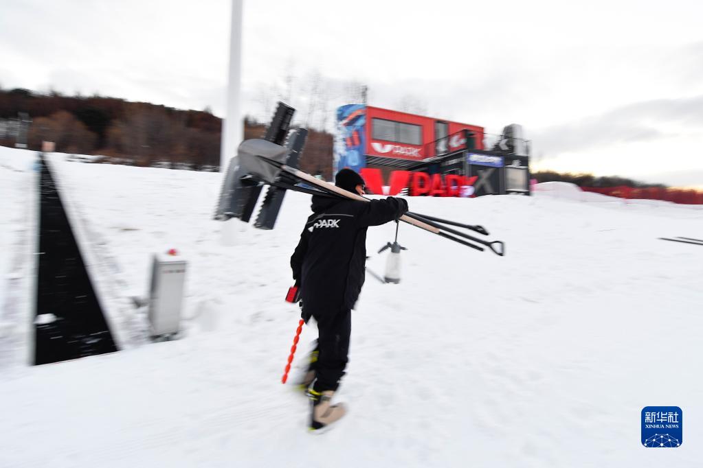 一名V-PARK地形公園團(tuán)隊(duì)成員攜帶工具前往作業(yè)地點(diǎn)(12月9日攝)。