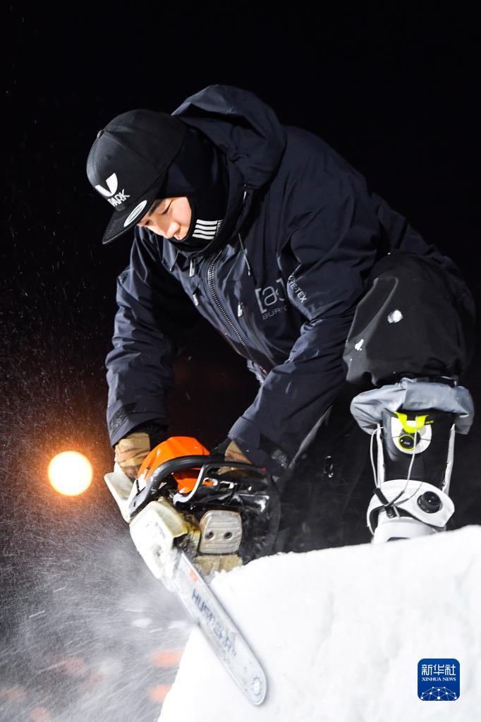 V-PARK地形公園主理人魏維使用電鋸進行跳臺塑形工作(12月9日攝)。