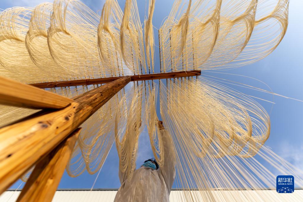 12月12日,在竹塘社區掛面合作社的掛面車間,工人將掛面上架晾曬。