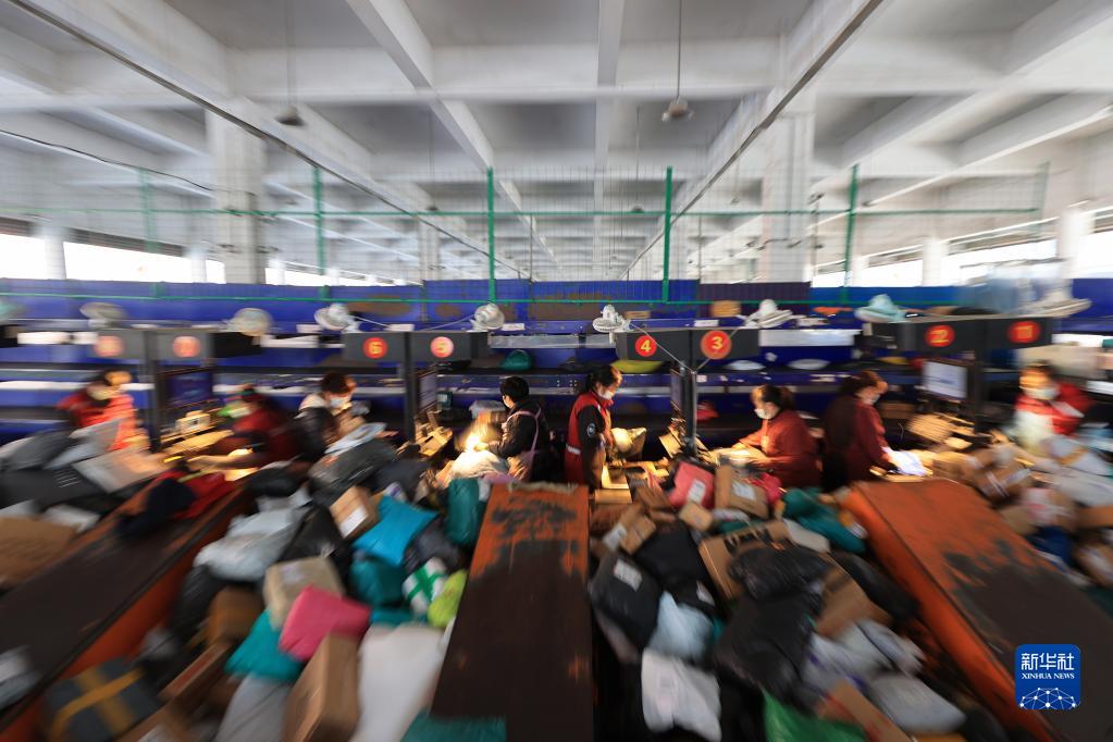 12月12日,在浙江省湖州市吳興區(qū)八里店鎮(zhèn)一家物流企業(yè),工作人員分揀快遞。