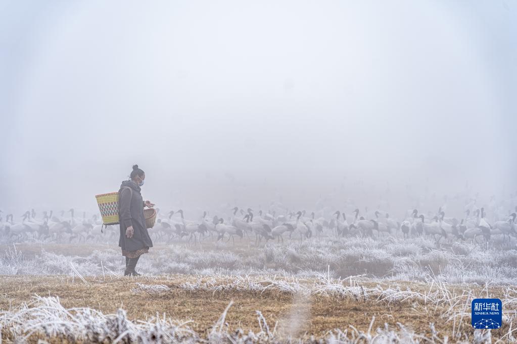 12月10日,陳光會在云南大山包黑頸鶴國家級自然保護區給黑頸鶴投食。