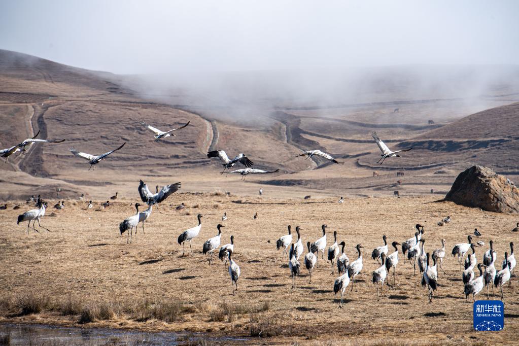 這是12月11日在云南大山包黑頸鶴國家級自然保護區內拍攝的黑頸鶴。