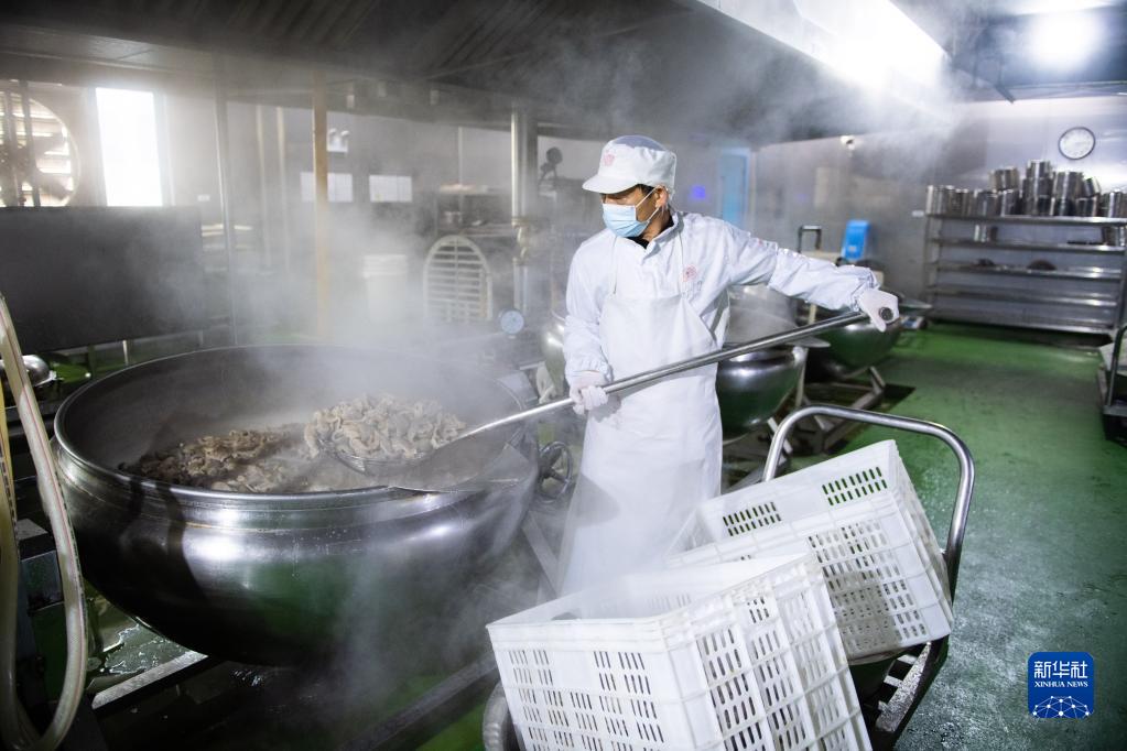 12月13日,在湖南彭記坊農(nóng)業(yè)科技發(fā)展有限公司預(yù)制菜生產(chǎn)車間,工作人員在烹飪食材。