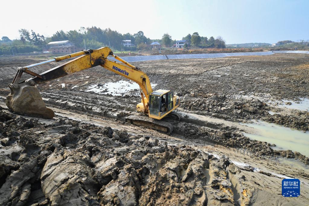 工人在湖南省湘潭市湘鄉市泉塘鎮雙江村使用機械修建用于農田灌溉的蓄水塘(11月17日攝)。