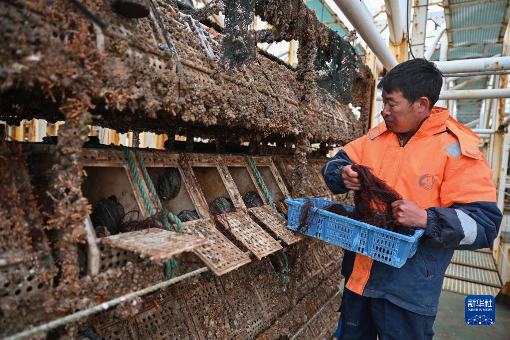 12月13日,漁民在連江縣深遠海鮑魚機械化養殖平臺“福鮑1號”上用龍須菜喂養鮑魚。