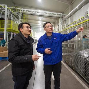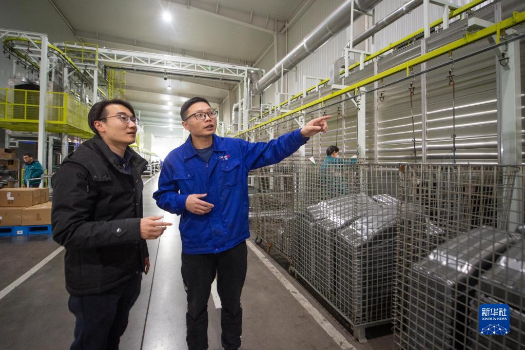 12月14日,陶朱街道駐企指導員(左)與浙江創格科技股份有限公司負責人在生產車間內交流企業生產經營情況。