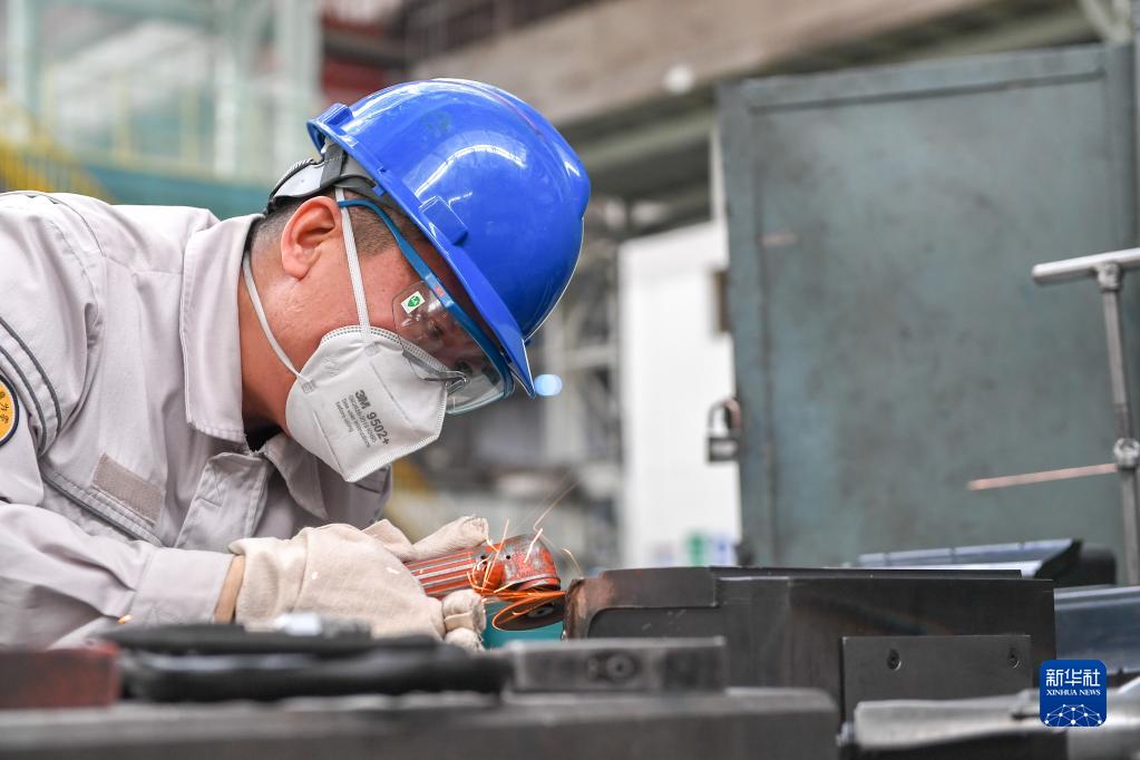 12月14日,在位于長春的一汽解放汽車有限公司卡車廠沖壓車間,馮斌打磨沖壓模具。