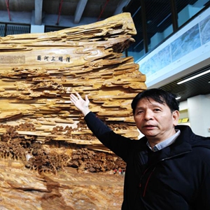 12月14日,國家級非遺項目莆田木雕省級代表性傳承人鄭春輝在介紹他的大型木雕作品《清明上河圖》。該件作品歷時近4年,在一棵長13米、最大直徑達3.5米的千年古樟木上雕刻而成。
