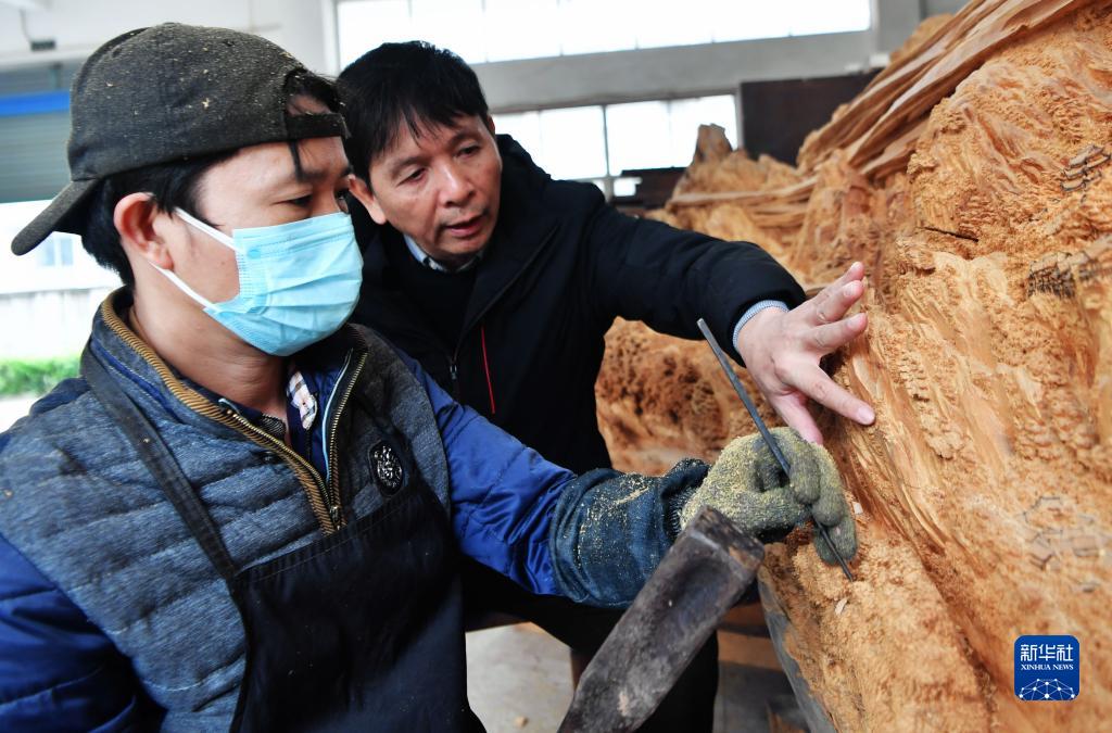 12月14日,國(guó)家級(jí)非遺項(xiàng)目莆田木雕省級(jí)代表性傳承人鄭春輝(右)在向員工傳授雕刻技藝。