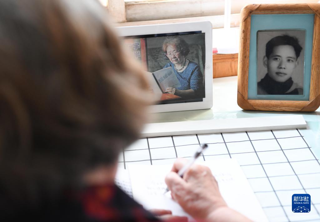 這是5月17日,在安徽省蕪湖市,83歲的張愛蘭老人在家中寫作。書桌上擺放著她和去世37年的愛人徐國誠的照片。