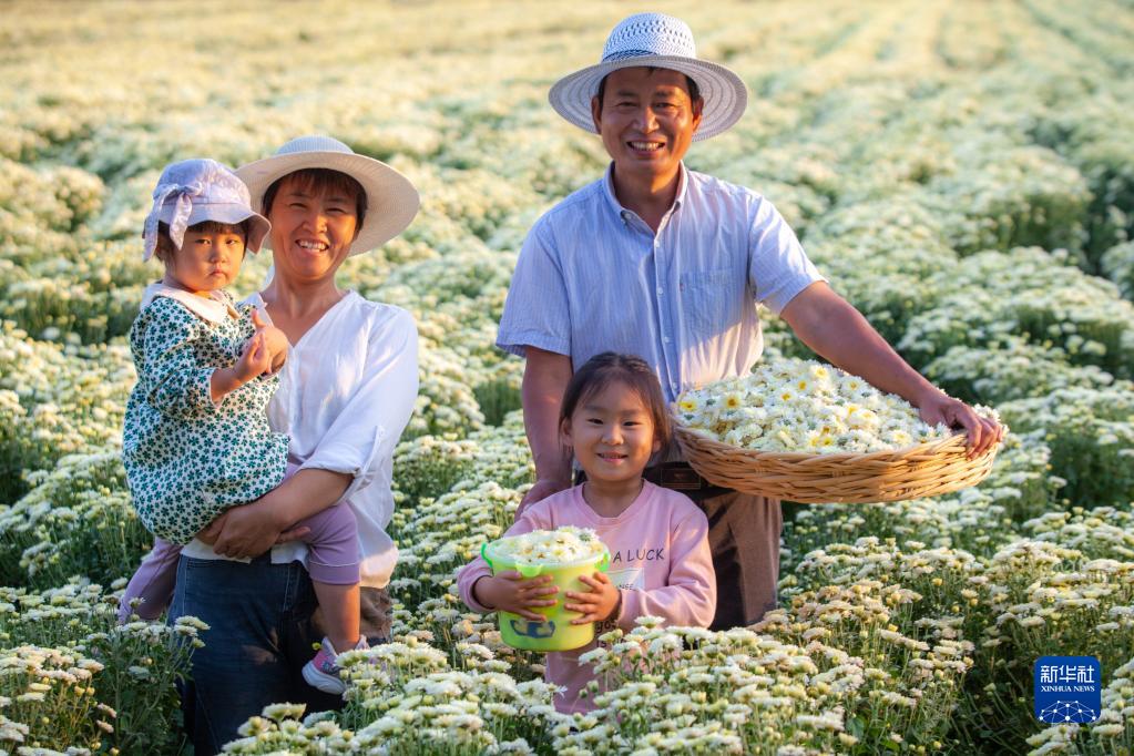 這是9月21日,在山東省淄博市高青縣黑里寨鎮(zhèn)黑二村,種植中藥材的“70后”家庭農(nóng)場主張新廣(右一)和家人在菊花田間合影留念。