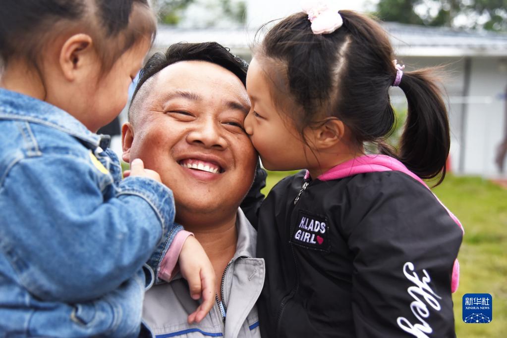 這是1月24日,在廣東省汕尾市海豐縣,沈海高速深圳到汕尾段改擴建項目工作人員楊興義在板房宿舍前與春節前夕來團聚的孩子們擁抱親吻。