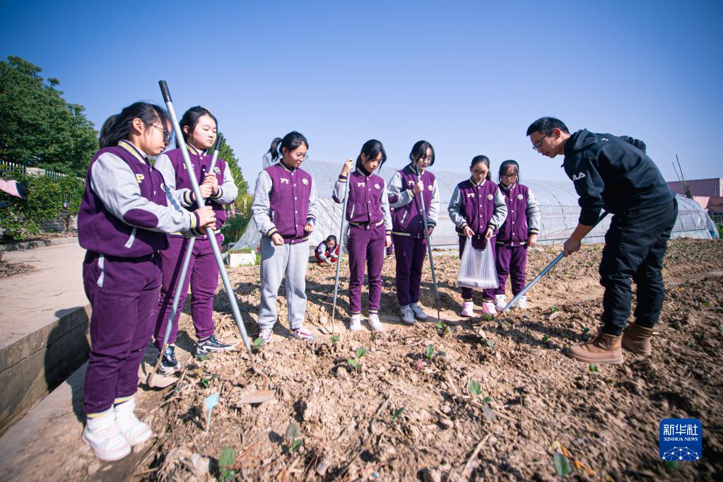 12月15日,諸暨牌頭鎮中心小學的老師在校內勞動教育基地為學生們講解耕種技巧。