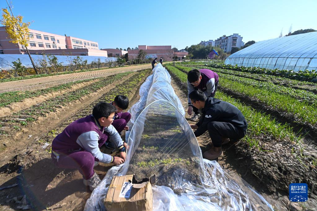 12月15日,諸暨牌頭鎮中心小學的老師帶領學生為校內勞動教育基地內種植的蔬菜搭建大棚。