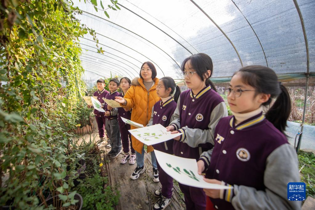 12月15日,諸暨牌頭鎮中心小學的老師帶領學生在校內勞動教育基地內認識中草藥。