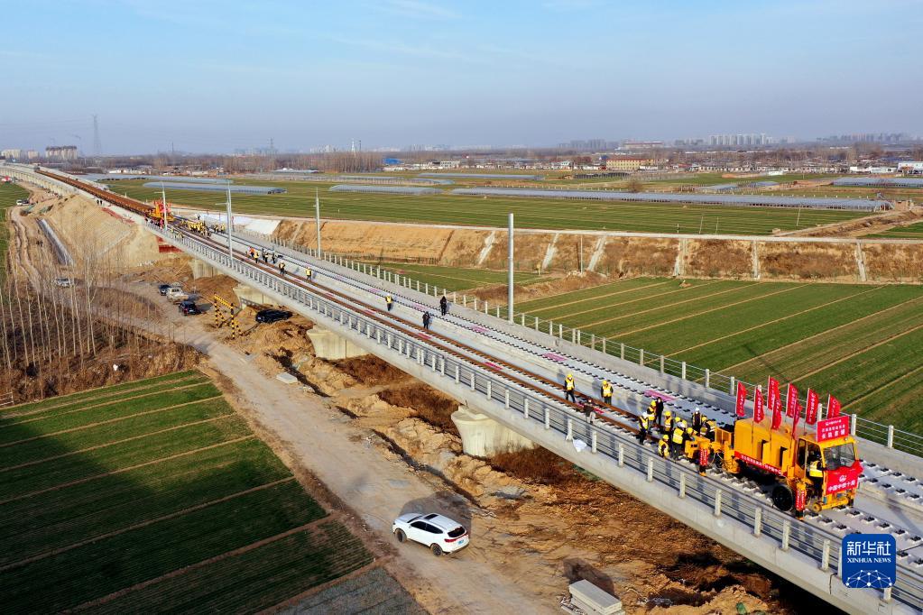 12月15日,在濟鄭高鐵山東聊城段,中鐵十局的工作人員在進行鋪軌作業(無人機照片)。