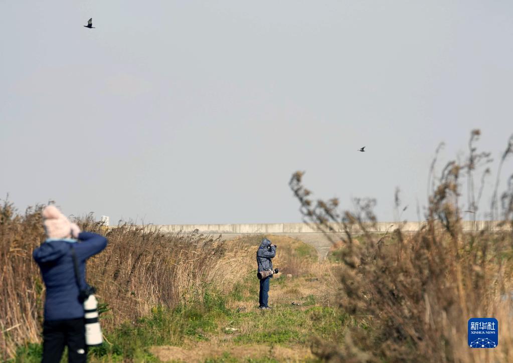 12月17日,在上海崇明東灘自然保護區,濱海社區觀鳥邀請賽的參賽者在觀鳥。