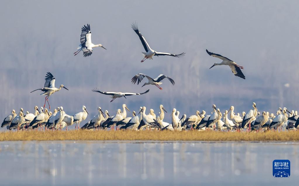 近日,數(shù)百只東方白鸛飛臨山東省臨沂市郯城縣沂河畔越冬,給平靜的河灘增添了一道靚麗的風(fēng)景。