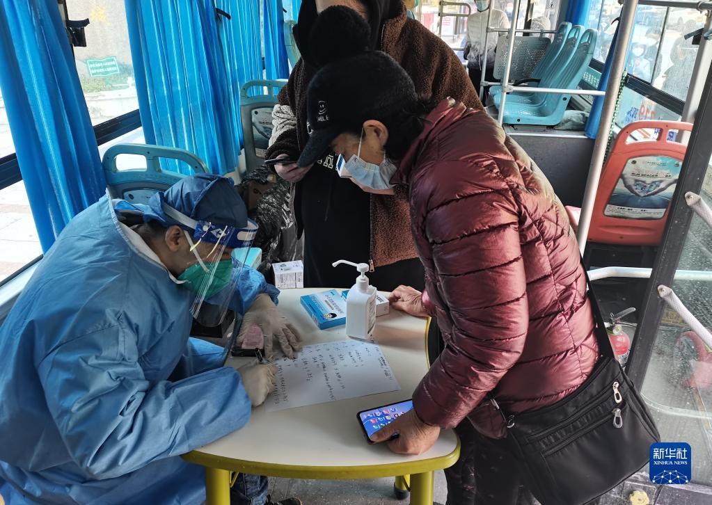 12月20日,在江寧區麒麟街道華匯康城小區,醫生在發熱流動診療車上服務群眾。