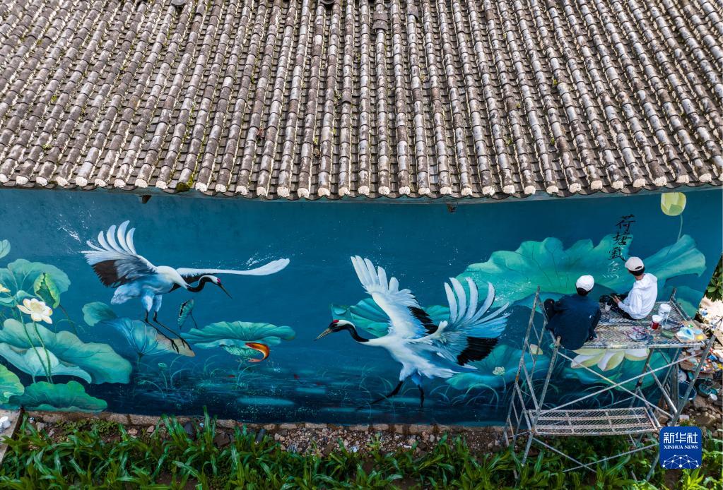 6月24日, “95后”公益墻繪師劉志誠(右)在云南省麗江市永勝縣三川鎮進行墻繪創作(無人機照片)。