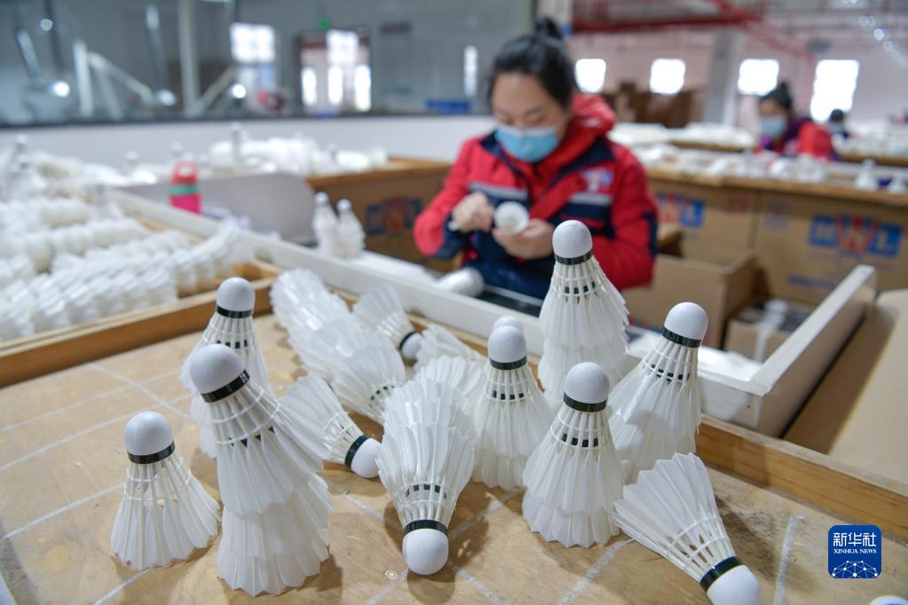 在錦屏經濟開發區貴州亞獅龍體育文化產業發展有限公司羽毛球生產基地,工人在檢查羽毛球成品(12月19日攝)。
