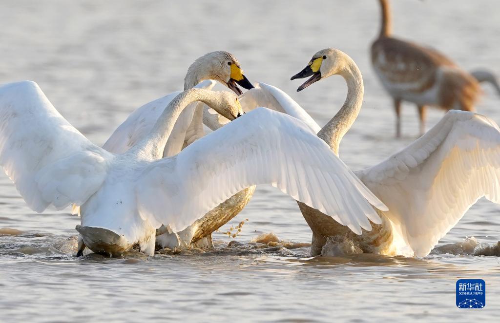 幾只天鵝在南昌高新區(qū)五星白鶴保護小區(qū)嬉戲(12月21日攝)。