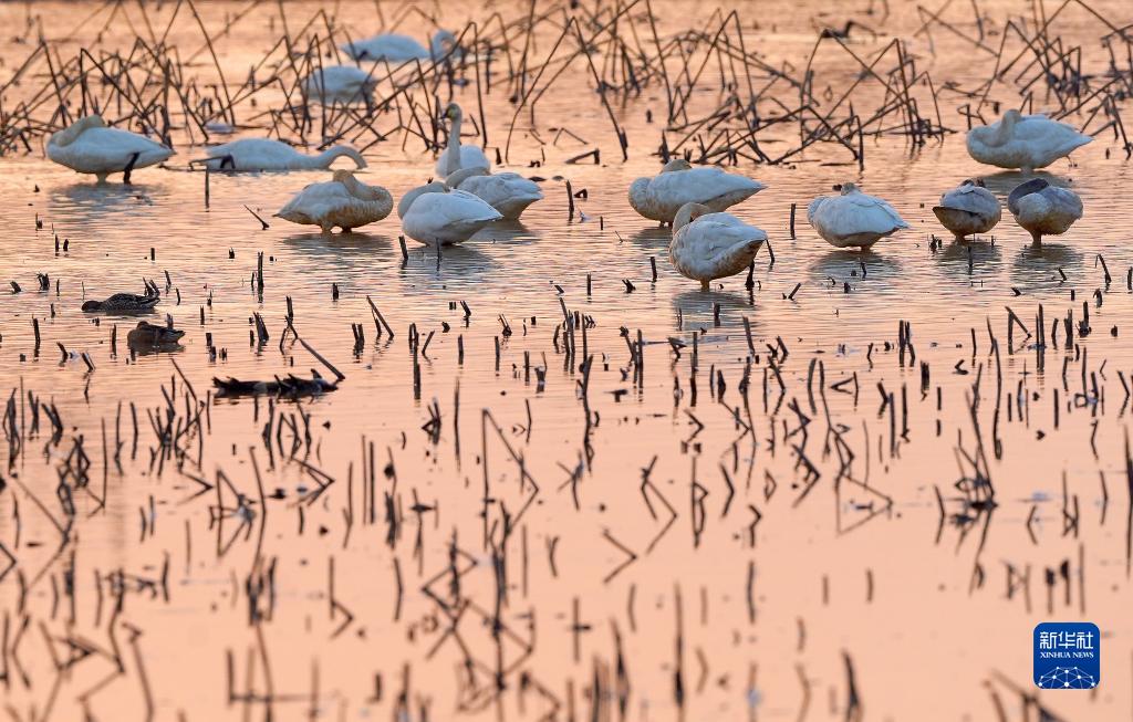 天鵝等候鳥在南昌高新區(qū)五星白鶴保護(hù)小區(qū)里棲息(12月21日攝)。